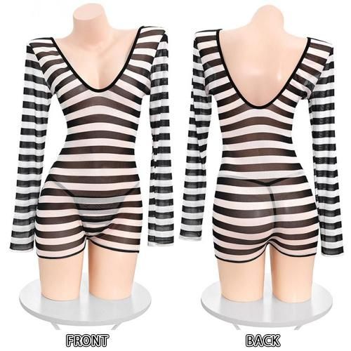 拘束されることで解き放たれる快感が警官をも虜にする囚人風セクシーコスプレ(SEXYCOSPLAY)。囚人を思わせるボーダー柄のオールインワンは、ざっくりとあいた胸元に透け感のあるチュールが肌の露出を高め、ハーネスなどのハード要素が刺激的なセット。オールインワンは、クロッチ部分のボタンをとめてパンツスタイルに、外せばワンピースとしても着用できる2WAY仕様。リード付きのチョーカーを身に着けることでパートナーに支配され、ボディラインが強調されるハーネスは視覚的な刺激を与えます。さらに、手枷を身に着けることで動きが制限され、より背徳感と興奮度がアップ。手枷はチョーカーやハーネスなど、好きな箇所に取り付け可能でプレイの幅が広がります。
