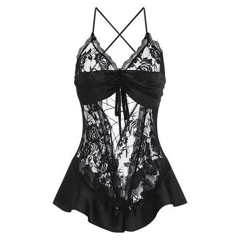 曲線美を魅せつけオープンクロッチで官能的な驚きをまとうセクシーテディ(SEXYTEDDY)。セクシーな透け感たっぷりのレースにポイントのサテンリボンが甘くフェミニン。深く開いた胸元にレースから透けたバスト、そしてクロッチに向けVラインのチュール切り替えがシャープでセクシーにスタイルアップ。クロスにレースアップデザインのバックスタイルは、軽やかに揺れる腰のサテンフリルがウエストから丸みあるヒップの曲線を美しく魅せてくれます。フリルがボディラインを優雅に飾りながら視線を誘い、露出したヒップ、さらにクロッチレスの大胆さがパートナーを官能的に翻弄し想像力をかき立てます。