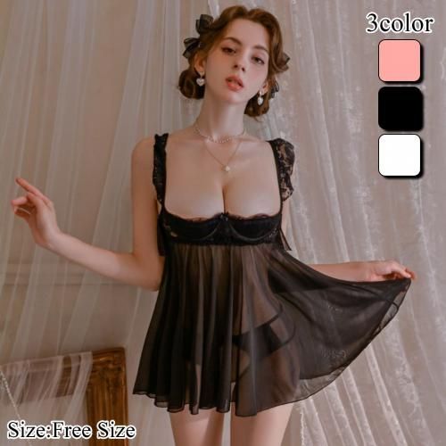 溢れ出すバストで誘うレースフリルの愛されベビードール(BABYDOLL)。繊細な透かし彫りレースとシアーなメッシュが織りなす極上の肌触りのランジェリー。肩紐にあしらわれたレースフリルが可愛らしさを添えつつ、U字ワイヤーで支えられたハーフカップから溢れ出す、こぼれるほどのバストの迫力に視線が釘付け。メッシュ越しに透けるショーツはクロッチがストリングのみでヒップまで大胆に露出させたオープンクロッチ仕様で、ミニ丈のワンピースの丈感と相まってヒップが見え隠れする扇情的なデザイン。背中側は2列3段のホックでサイズ調整が可能で様々な体型の方にもお使いいただける、夜を情熱的に彩るセンシュアルなランジェリーセットとなっています。